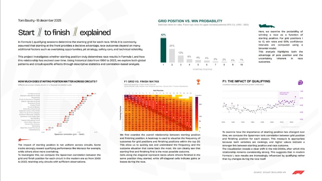 Dataviz sur la grille de départ et les résultats en course en F1 (1950–2023), à partir de l’API Ergast.